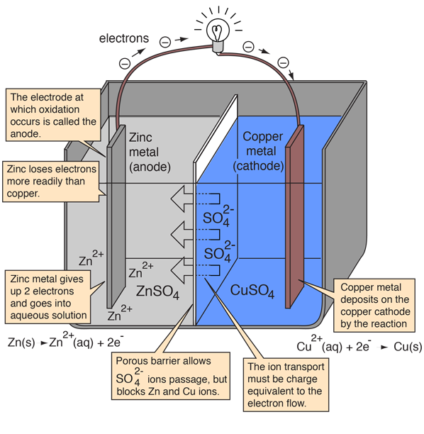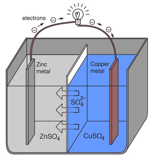 Electrochemical CellsAn extremely important class of oxidation and reduction reactions are used to provide useful electrical energy in batteries. A simple electrochemical cell can be made from copper and zinc metals with solutions of their sulfates. In the process of the reaction, electrons can be transferred from the zinc to the copper through an electrically conducting path as a useful electric current. An electrochemical cell can be created by placing metallic electrodes into an electrolyte where a chemical reaction either uses or generates an electric current. Electrochemical cells which generate an electric current are called voltaic cells or galvanic cells, and common batteries consist of one or more such cells. In other electrochemical cells an externally supplied electric current is used to drive a chemical reaction which would not occur spontaneously. Such cells are called electrolytic cells.