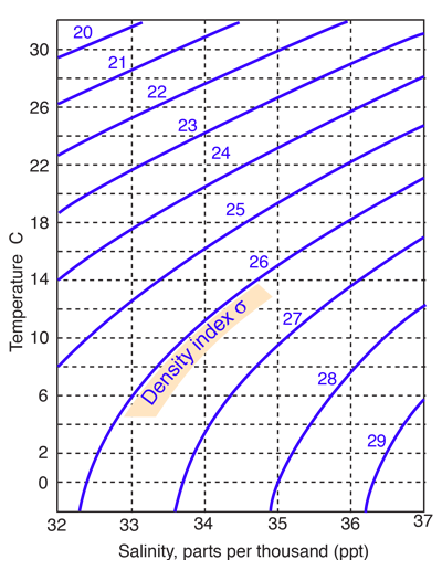 Seawater has an average density of 1.027 gm/cm3, but this varies with temperature and salinity over a range of about 1.020 to 1.029. The density is typically indicated by a density index σ which is the departure of the density from 1.000 multiplied by a thousand. |