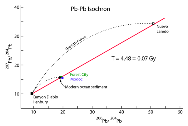 Pb-Pb Isochron Dating![]() After Patterson, 1956 There are a number of useful isotope systems which constitute clocks in the rocks and are useful for geologic dating. But if asked what is the most reliable and precise method for dating the Earth and meteorites, Brent Dalyrymple would point to lead isochrons. He calls the lead method "the hourglass of the solar system". The current approach to plotting Pb-Pb isochrons is referred to as the Holmes-Houtermans method. The above diagram from Patterson represented a major breakthrough in the use of lead isochrons when it was published in 1956. It presented the analysis of three stony meteorites and two iron meteorites and showed that they fell on the same isochron. In addition, it showed that a sample of modern ocean sediment fell on the same isochron. Besides offering confirmation of the meteorite age that had been approached in many studies, it offered evidence that meteorites and the Earth are closely related and of the same age. Like most modern lead age studies, it used the troilite mineral from the Canyon Diablo meteorite as the standard. The isochron age was reported by Patterson as 4.55 Gy, but that becomes 4.48 Gy with the application of the revised decay constants for the isotopes involved.
