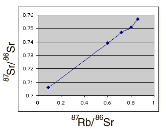 This data was plotted with the spreadsheet Excel as shown below. ![]() The age consistent with the slope of this plot can be calculated in a way which makes use of the non-radiogenic 86Sr as a reference. The slope obtained was m=0.0676, using the point-slope form of a line, y = mx + b, and the corresponding age is 4.6 x 109 years. The intercept b = 0.70 suggests that these values for isotopic abundances are consistent with an original strontium isotope ratio 87Sr/ 86Sr = 0.7 . While the consistency is remarkable, there are uncertainties. A glance at the plot above shows that the Homestead meteorite is a bit off the line with the others. In fact, if just an average of the point-to-point slopes for all the data points is used, including the Homestead meteorite, an age of 4.7 billion is obtained, showing that there is a significant uncertainty in the dates obtained. The 4.6 billion year value was obtained by eliminating the Homestead meteorite, since that appeared to give a more consistent slope for the curve. This is all the data I have about these particular samples - comments about this scenario are invited. |