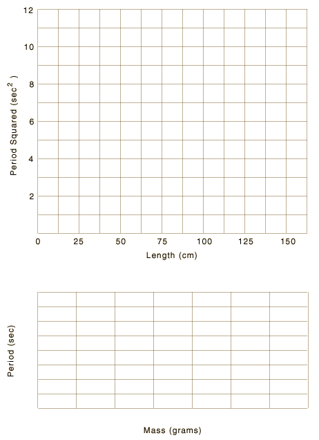 2. Using successive masses 100, 200, and 500 grams, make a pendulum of length 50 cm and determine the corresponding periods. Since different masses cause different amounts of stretching of the string, the length should be adjusted to exactly 50 cm and remeasured for each mass. The length should be measured to the center of the hanging mass. Mass 100 gm 200 gm 500 gm Period __________ ________ ____________ Plot the period as a function of the mass. 3. Using the 100 gm mass and a length of 50 cm, pull the pendulum bob