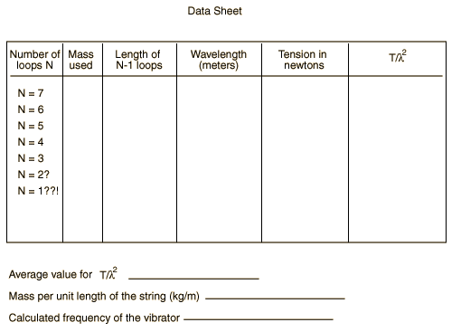 If a light, flexible string is attached to a vibrator and the other end passed overr a fixed pulley to a weight hanger, the necessary conditions for standing waves can be met. Waves from the vibrator travel down the string and are reflected at the pulley. When the tension and length of the string are properly adjusted, these two oppositely directed wave trains superimpose to give alternate regions of no vibration, N (see figure) and regions of maximum vibration, A. These regions N and A are called nodes and antinodes, respectively, and the segment between two nodes is called a loop. The velocity, v, of a wave on a stretched string is given by: