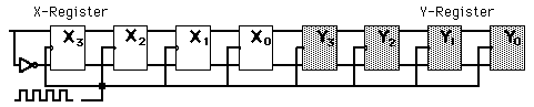 Parallel Data TransferThe illustration below shows the parallel transfer of 8 bits of data from the X Register to the Y Register upon application of an enabling transfer pulse. Clearly, parallel data transfer is faster than serial data transfer, but serial transfer has the advantages of requiring less hardware. These registers are made up of D flip-flops, which can serve as memory locations. The information in the X Register is intact after the transfer to the Y Register, so this process shows a possible scenario for accessing digital information stored in memory. ![]() |