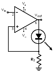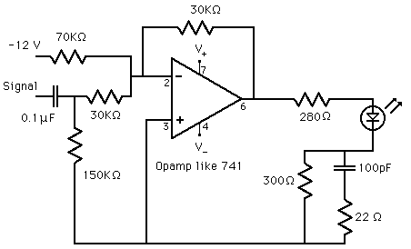 LED Modulation CircuitThis op-amp application is a summing amplifier where the signal input has a gain of -1 and the 12V supply is amplified by -3/7 to provide enough voltage to turn on the LED to get it into its linear range. The change in light output is then proportional to the signal voltage. ![]() Modulation of an LED is one common way of getting a signal into a fiber optic transmission line. |