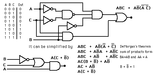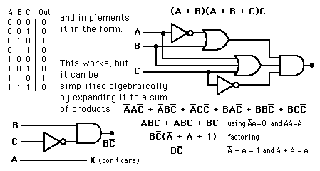 The logic form which comes from the direct application of the truth table will work, but it is often inefficient and takes an unneccessarily large number of gates. Logic expressions can often be simplified algebraicly, and although there is no fixed procedure, the following rules are often helpful.