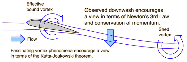 Bernoulli or Newton's Laws for Lift?Which is best for describing how aircraft get the needed lift to fly? Bernoulli's equation or Newton's laws and conservation of momentum? This has been an extremely active debate among those who love flying and are involved in the field. If the question is "Which is physically correct?" then the answer is clear -- both are correct. Both are based on valid principles of physics. The Bernoulli equation is simply a statement of the principle of conservation of energy in fluids. Conservation of momentum and Newton's 3rd law are equally valid as foundation principles of nature - we do not see them violated. This physical validity will undoubtedly not quell the debate, and this treatment will not settle it. But perhaps it can at least indicate the lines of the discussion. ![]() Those who advocate an approach to lift by Newton's laws appeal to the clear existance of a strong downwash behind the wing of an aircraft in flight. The fact that the air is forced downward clearly implies that there will be an upward force on the airfoil as a Newton's 3rd law reaction force. From the conservation of momentum viewpoint, the air is given a downward component of momentum behind the airfoil, and to conserve momentum, something must be given an equal upward momentum. Those who prefer to discuss lift in these terms often invoke the Kutta-Joukowski theorem for lift on a rotating cylinder. The lift on a spinning cylinder has been clearly demonstrated, and its discussion includes a vortex in the circulating air. Many discussions of airfoil lift invoke such a vortex in the effective circulation of air around the moving airfoil. Conservation of angular momentum in the fluid requires an opposite circulation in the air shed from the trailing edge of the wing, and such vortex motion has been observed. ![]() Those who advocate the Bernoulli approach to lift point to detailed measurement of the pressures surrounding airfoils in wind tunnels and in flight. Such pressure measurements are typically done with Pitot tubes. Correlating the pressures with the Bernoulli equation gives reasonable agreement with observations. Those who argue against modeling the lift process with the Bernoulli equation point to the fact that the flow is not incompressible, and therefore the density changes in the air should be taken into account. This is true -- the ideal gas law should be obeyed and density changes will inevitably result. This does not render the Bernoulli equation invalid, it just makes it harder to apply. But the pragmatic success of modeling the lift with Bernoulli, neglecting density changes, suggests that the density changes are small. Pragmatic difficulties exist also for those who would model the lift from Newton's third law -- it is difficult to measure the downward force associated with the downwash because is is distributed in the airstream leaving the trailing edge of the airfoil. Detractors from the Bernoulli approach often make calculations using the Kutta-Joukowski theorem (see Craig).