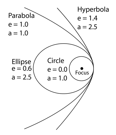 Each of the conic sections can be described in terms of a semimajor axis a and an eccentricity e. Representative values for these parameters are shown along with the types of orbits which are associated with them. |  |