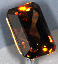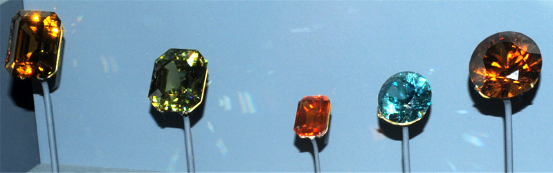 The collection above illustrates some of the variety of colors available from zircon gems. The two gems at left are 118 and 97.6 carats and are from Sri Lanka. The three at right are 49.2, 28.1 and 106.1 carats and are from Shantaboon, Thailand. The color of zircon gems can be changed by heating.