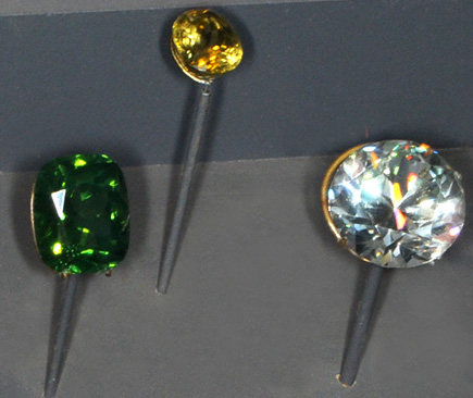 The zircon sample at left is about 1x8 cm and is from Fine, New York. The gems are 23.4, 10.4 and 48.3 carats and are from Sri Lanka. The gem at right is 103.2 carats and is from Thailand.