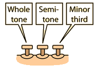 ![]() When a trumpet valve is up, the air goes straight through, and when it is depressed, a different air path is opened which adds a section of tubing. The length to add for the three valve intervals is calculated by using the fact that the frequency of an air column is inversely proportional to length.