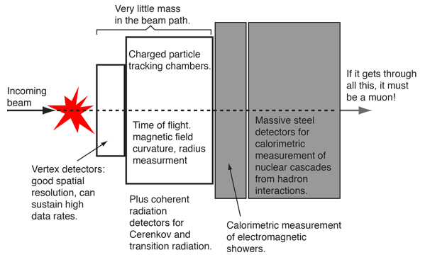 - "If it got through all that, it must be a muon!" Detecting muons by the fact that they penetrate all the calorimetric detectors.