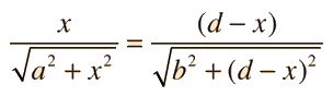 This derivation makes use of the calculus of maximum-minimum determination, the derivative of a square root, and the definitions of the triangle trig functions.
