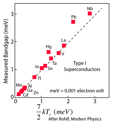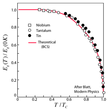 The reduction of the energy gap as you approach the critical temperature can be taken as an indication that the charge carriers have some sort of collective nature. That is, the charge carriers must consist of at least two things which are bound together, and the binding energy is weakening as you approach the critical temperature. Above the critical temperature, such collections do not exist, and normal resistivity prevails. This kind of evidence, along with the isotope effect which showed that the crystal lattice was involved, helped to suggest the picture of paired electrons bound together by phonon interactions with the lattice. |