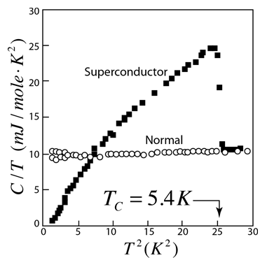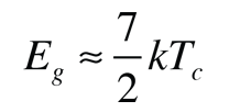 Exponential Heat CapacityAs it is warmed toward its critical temperature, the heat capacity of vanadium increases 100-fold in just 4 K. This exponential increase suggests an energy gap which must be bridged by thermal energy. This energy gap evidence was part of the experimental motivation for the BCS theory of superconductivity. From comparisons with other methods of determining the band gap, it is found that the constant "b" in the exponential heat capacity expression is one-half the band gap energy. If the slope of the line in the illustration is determined by scaling, it is about b=7.4k, corresponding to an energy gap of about 1.3 meV. This is slightly lower than the value obtained by other methods. The value predicted for vanadium from its critical temperature of 5.38 K by the BCS theory is 1.6 meV, and the measured value is close to that.