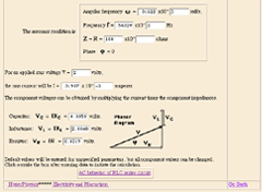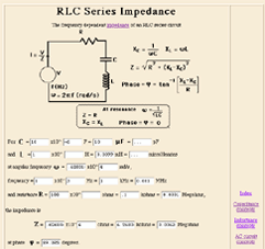|  Even more useful is a more involved calculation like a series RLC circuit. Doing this calculation once by calculator is a lot of work, so in the RLC lab, our students will typically put it on a spreadsheet. This Javascript calculation does essentially the same thing as the spreadsheet, but with the additional graphic elements which put it into context.